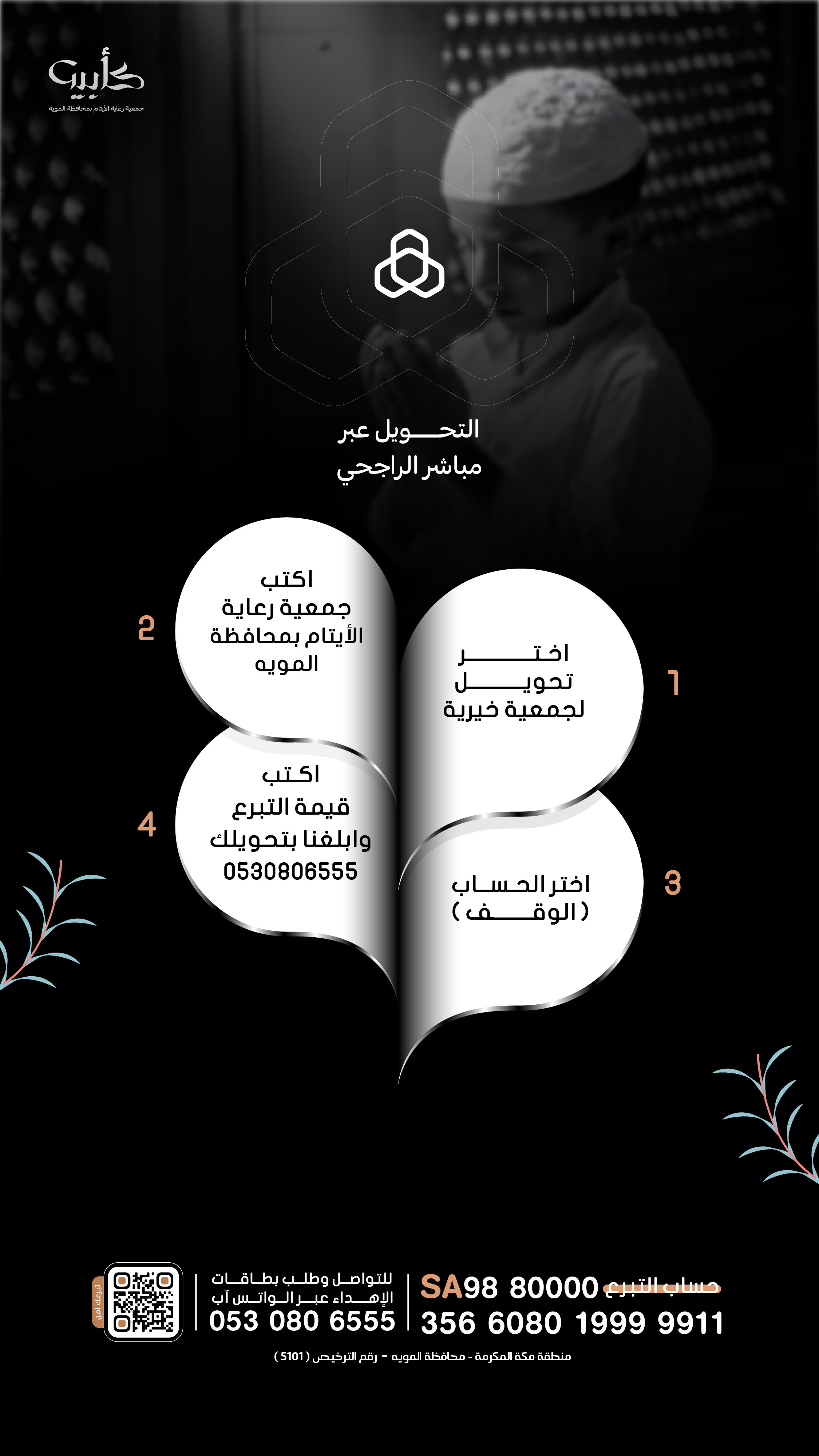 بكل حب وصدق نقدم لك فرصة لترك بصمة في حياة طفل يتيم يحتاج إلى يد الرحمة والعون بمساهمة قدرها 98 ريال يمكنك أن تكون السند الذي يحيي الأمل في قلب صغير فقد عائلته، وتذكر أن كفالة اليتيم هي شراكة في رحلة حياة جديدة مليئة بالأمل، والفرصة له أن يكبر في بيئة توفر له مشروع الرعاية والتعليم والفرصة لبناء مستقبل مشرق.